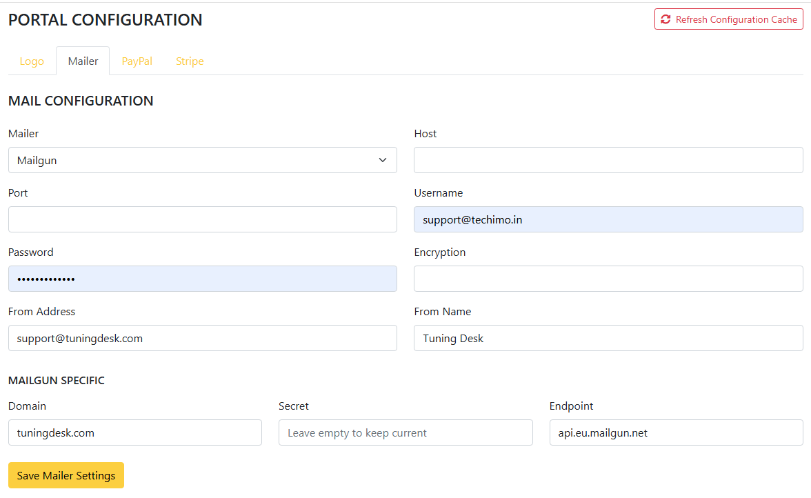 All values are saved securely and applied instantly across the portal. Support for popular providers such as SendGrid, Mailgun, and Amazon SES.