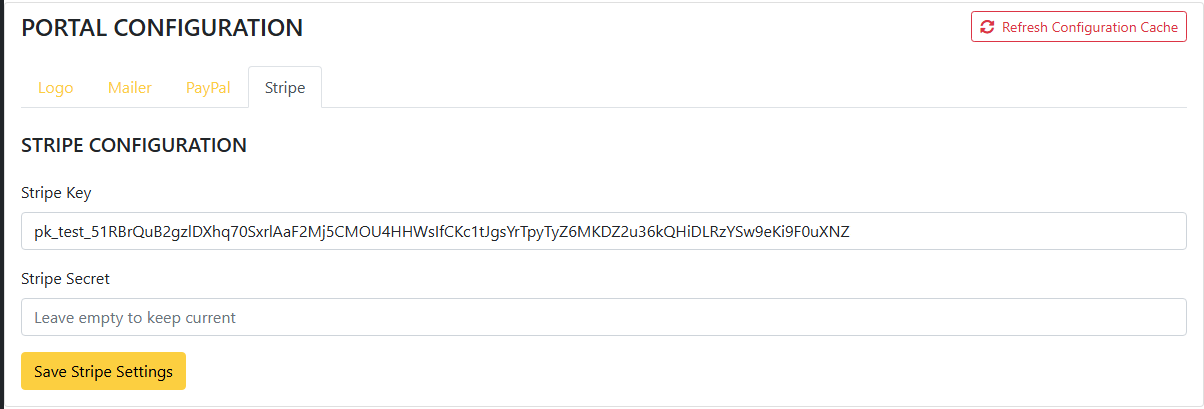 Stripe payment gateway setup is managed directly from the Portal Configuration page. Only Admin users can configure Stripe from the dashboard without manual .env file changes.